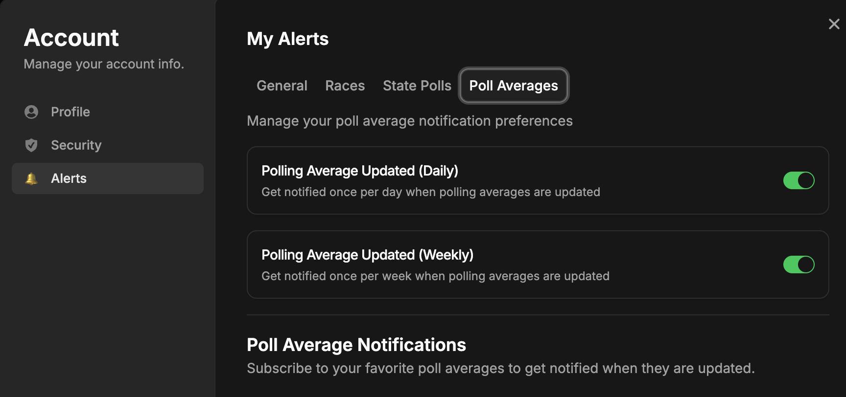 <mark style="color:$info;">In your profile, you’ll find a section called ‘My Alerts’ where you can manage all of the alerts you’ve signed up for.</mark>
